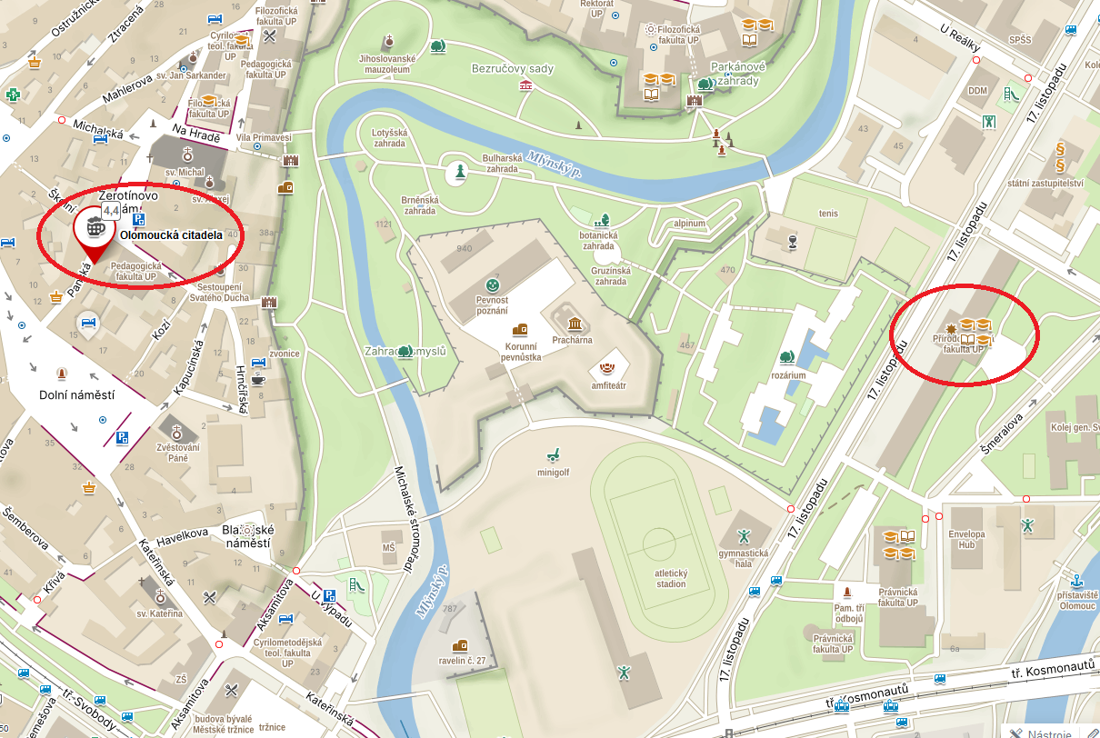 Z vlakového nádraží: tramvaj č. 1 (směr Nová Ulice) nebo č. 7 (směr Neředín); vystupte na zastávce „Envelopa“.Z autobusového nádraží: tramvaj č. 4 (směr Nová Ulice); vystupte na zastávce „Žižkovo náměstí“.